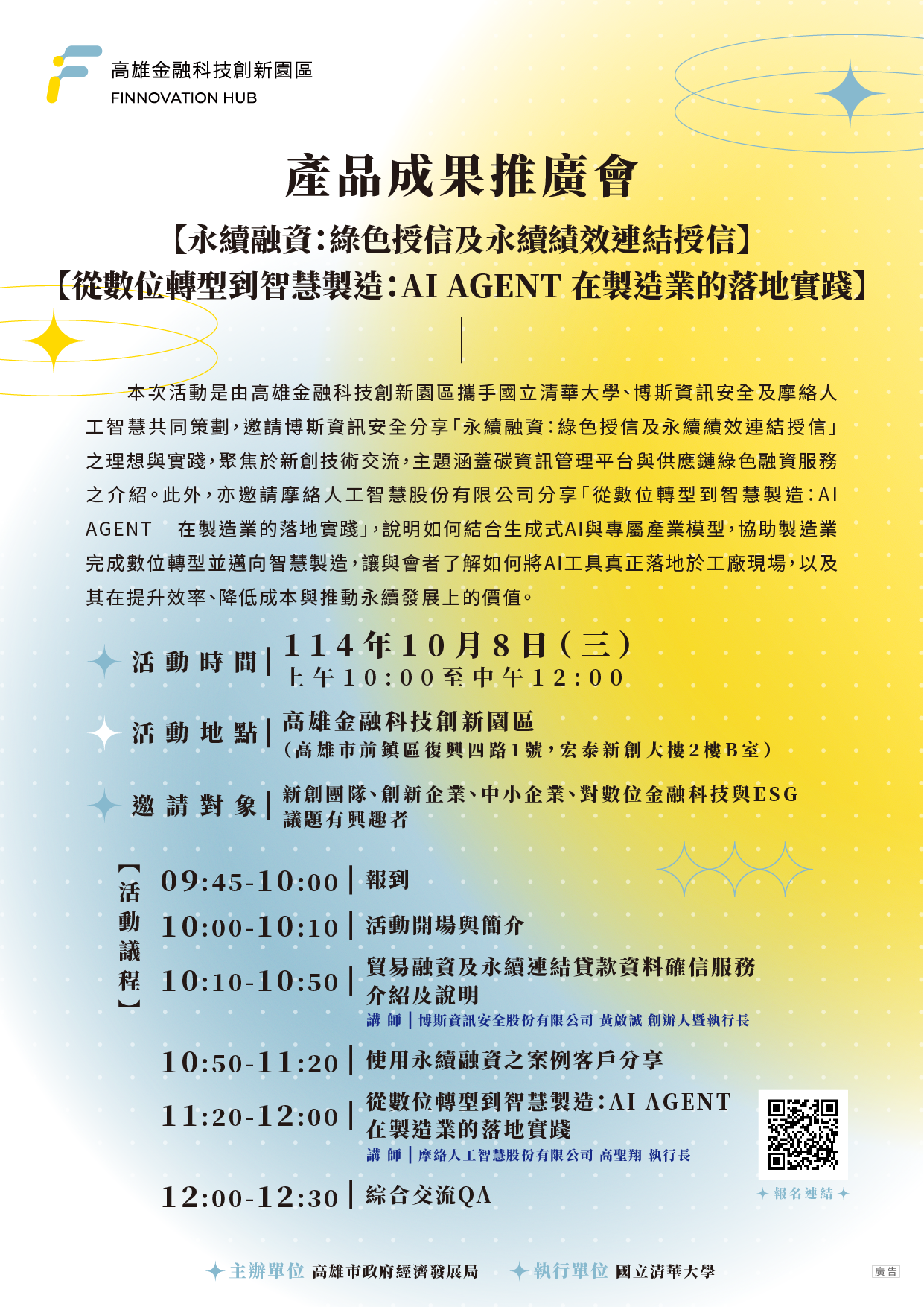 高雄金融科技創新園區攜手國立清華大學與博斯資訊安全,特別舉辦本次「成果推廣會」,聚焦新創技術與產業交流,串聯金融科技、智慧製造與綠色永續,共同探索未來轉型契機。🌿